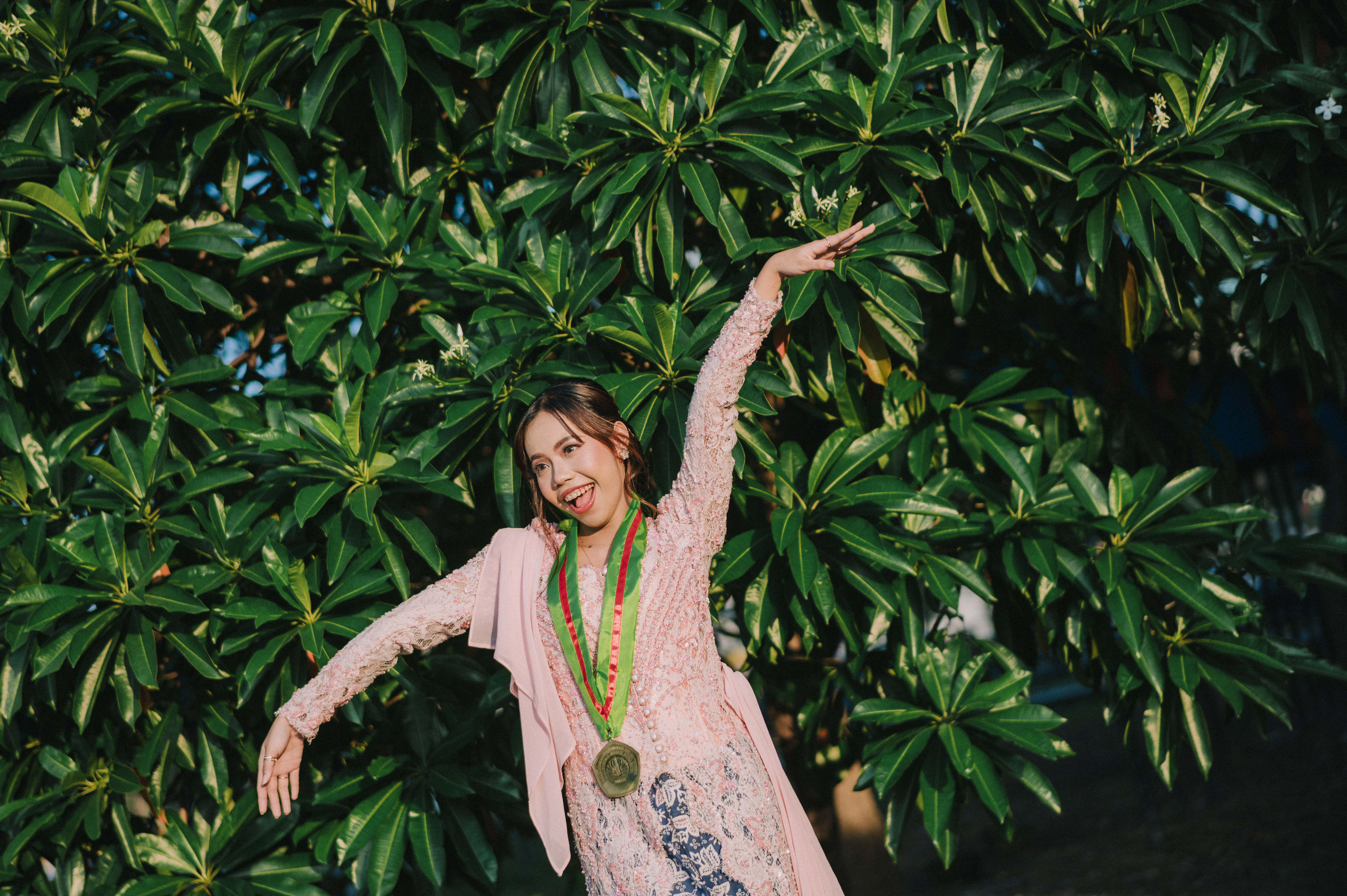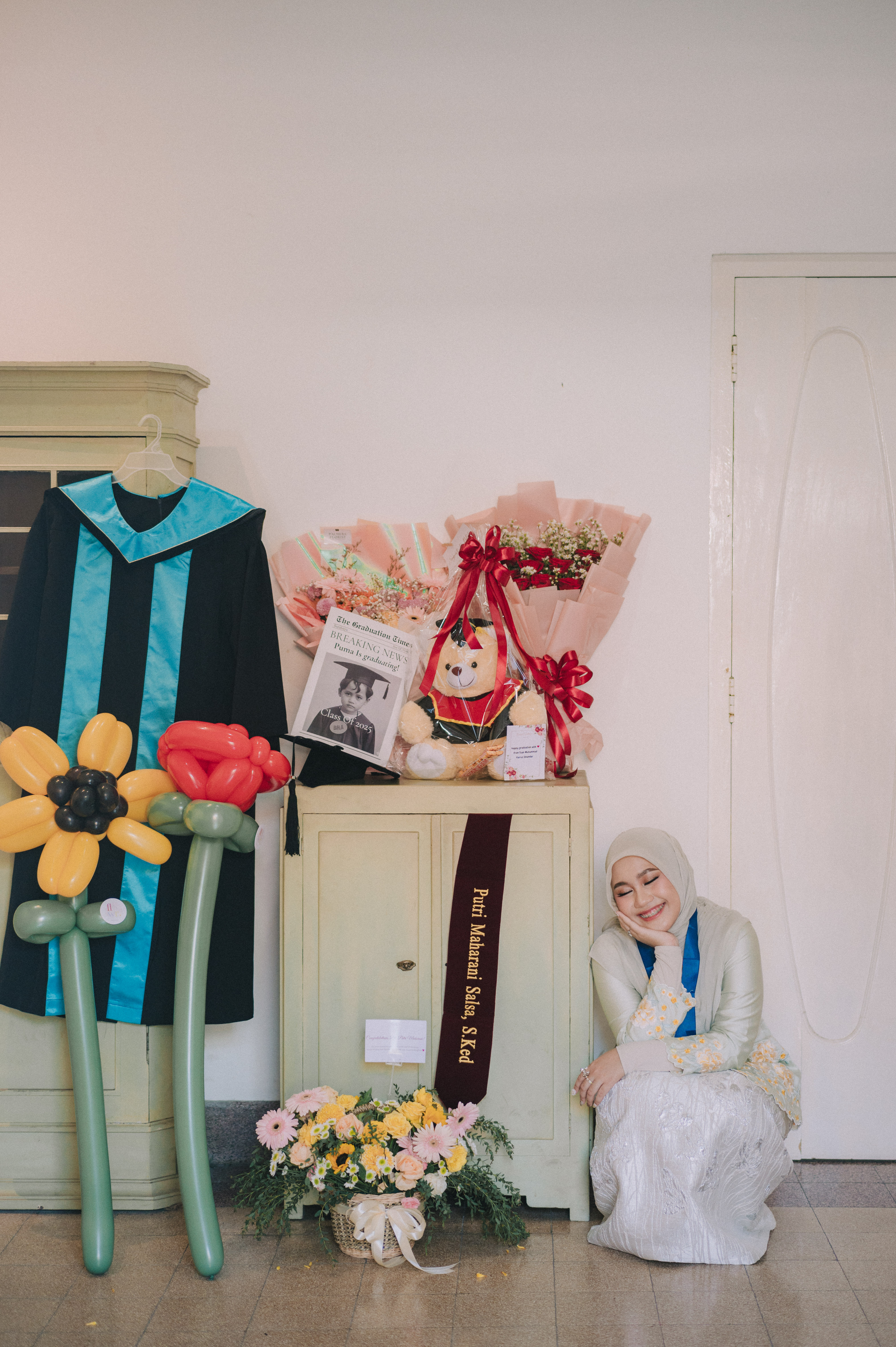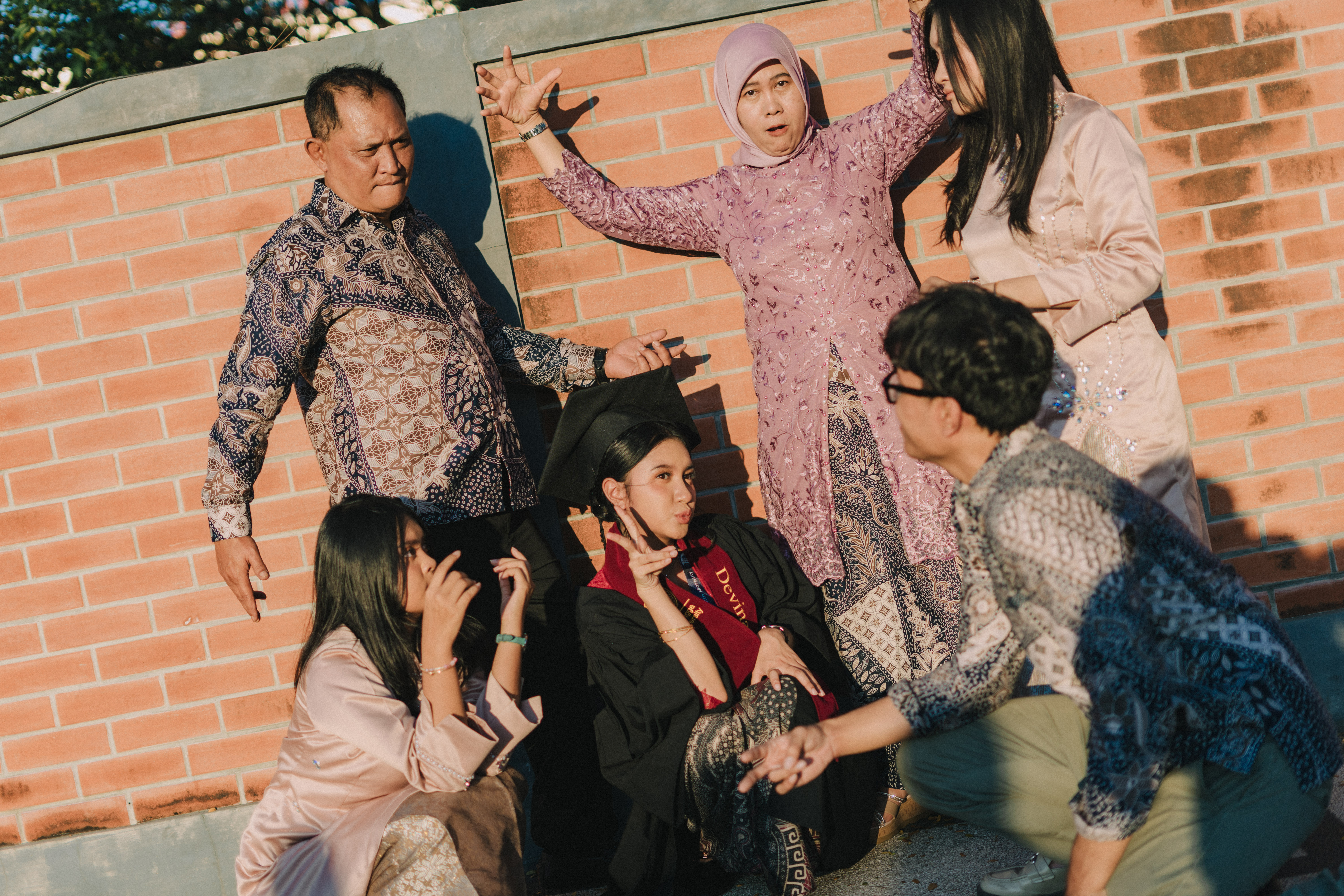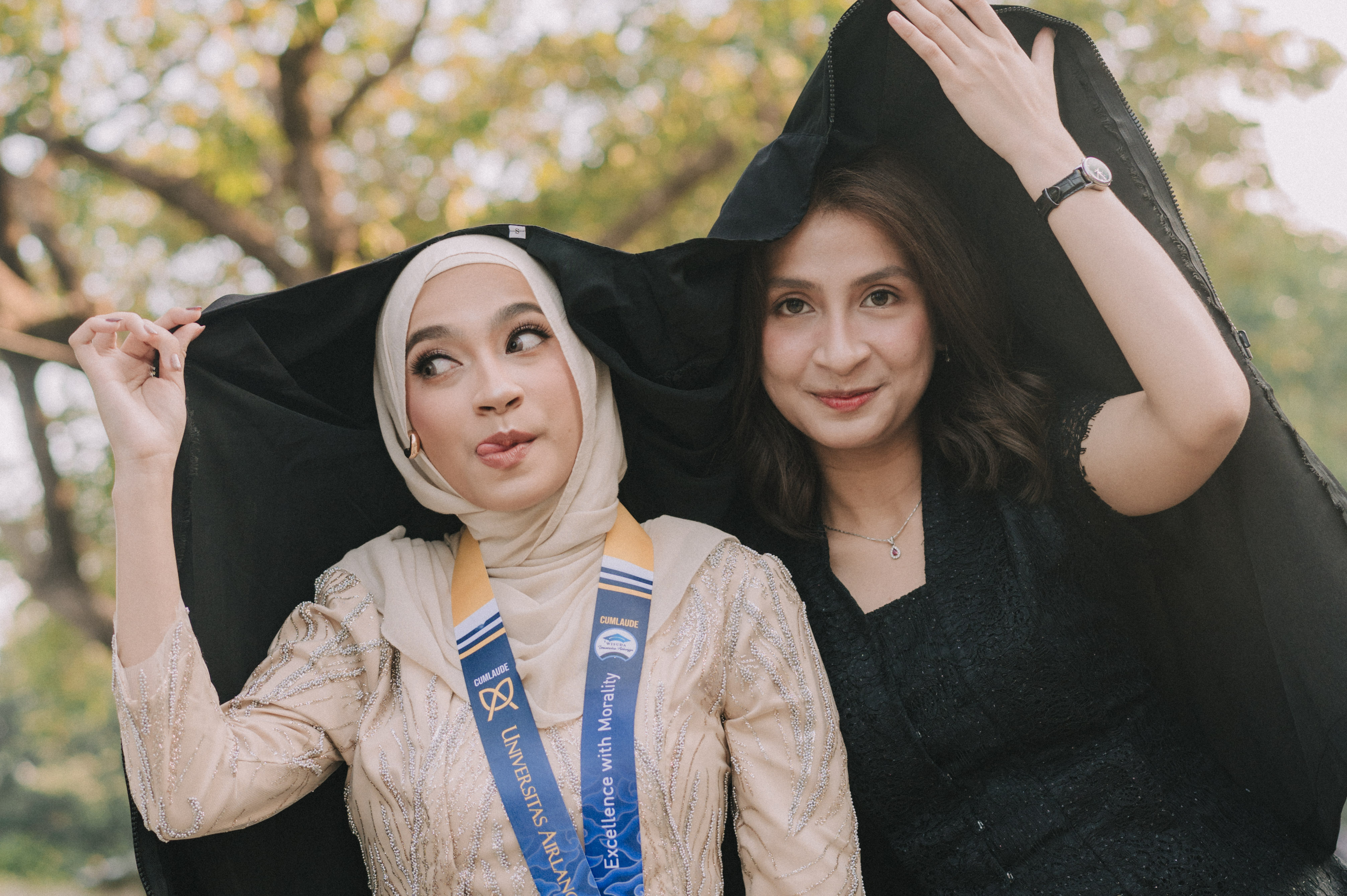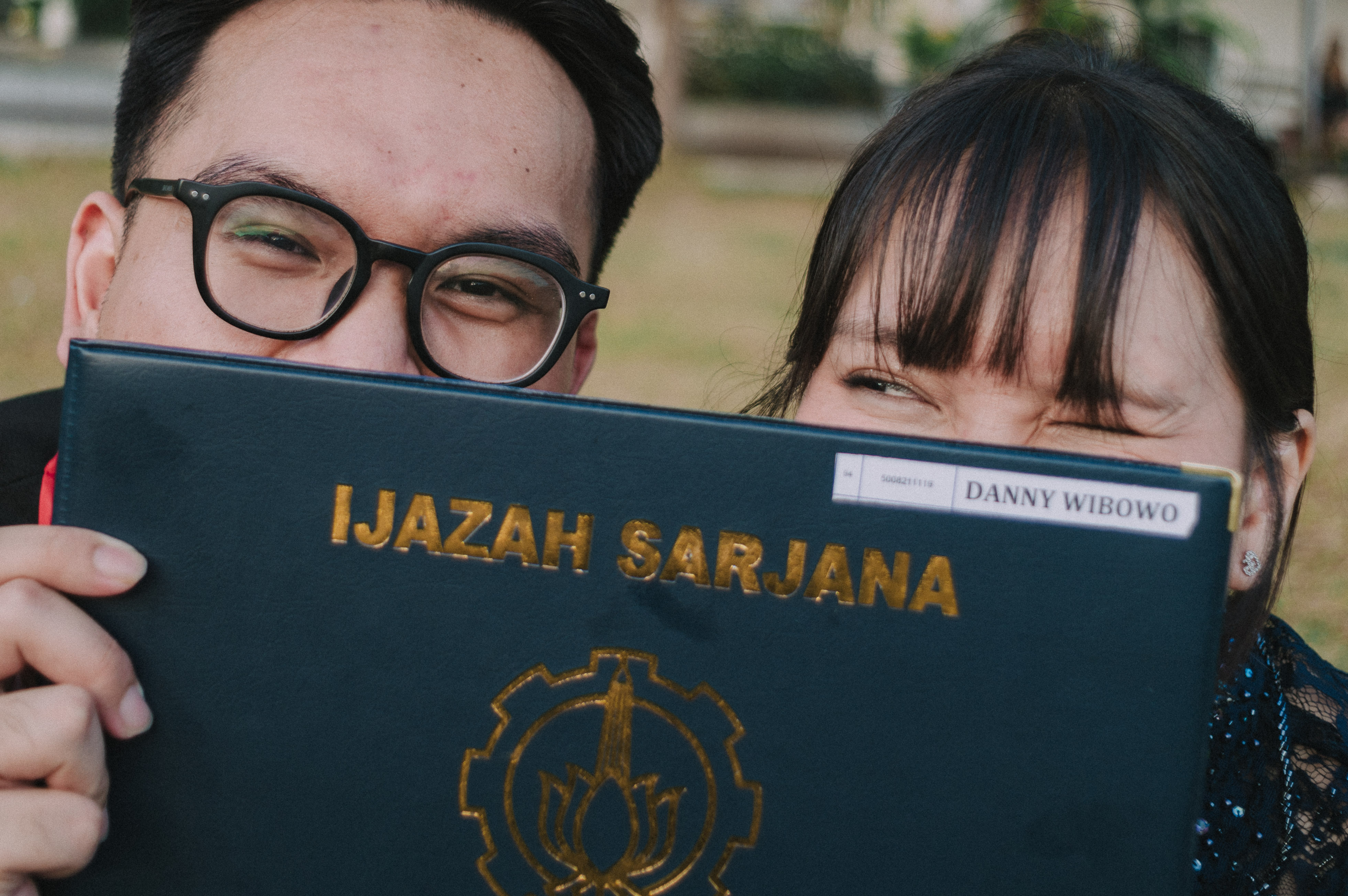 Sesi kelulusan di kampus Surabaya dengan tone hangat.