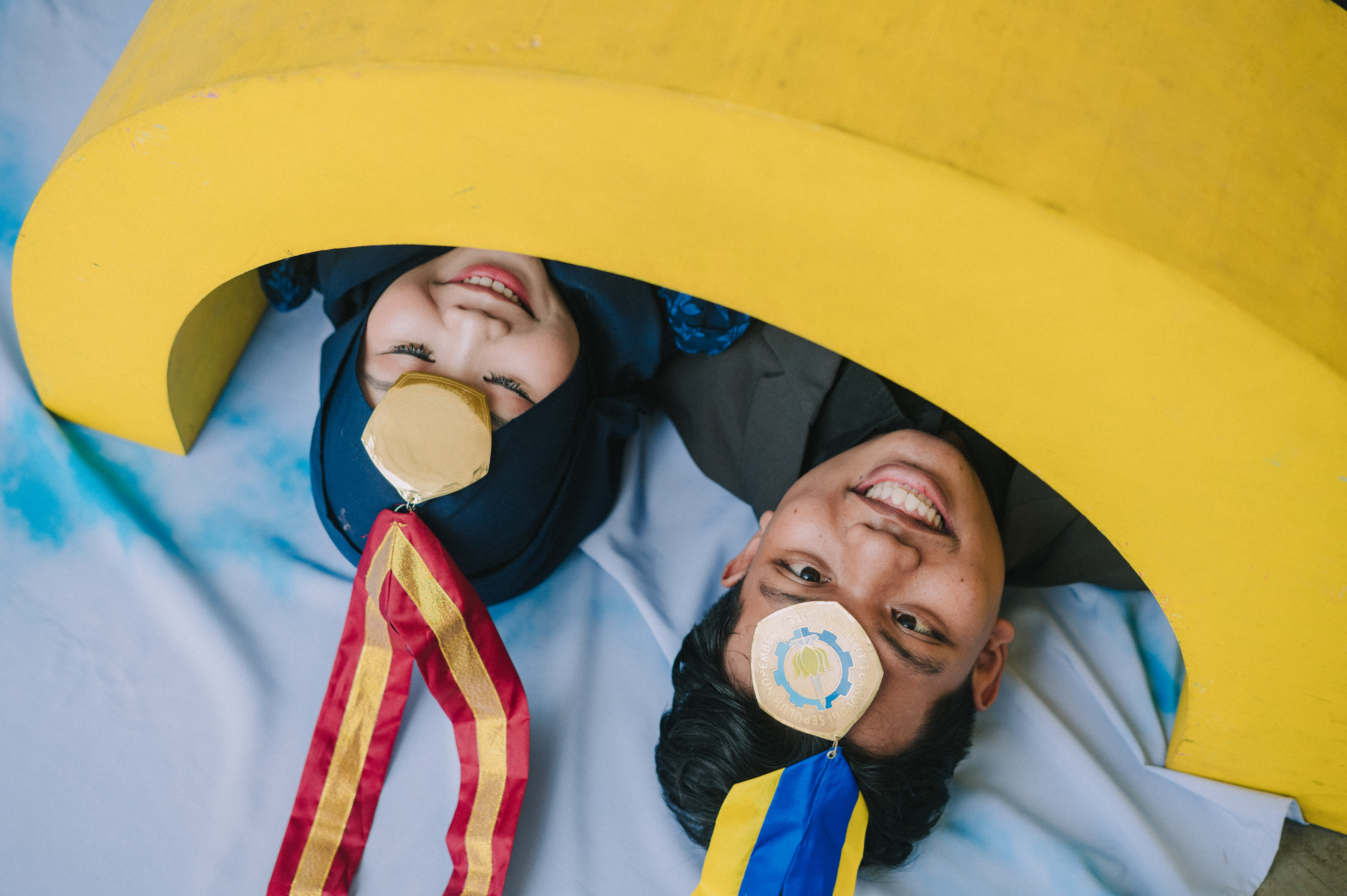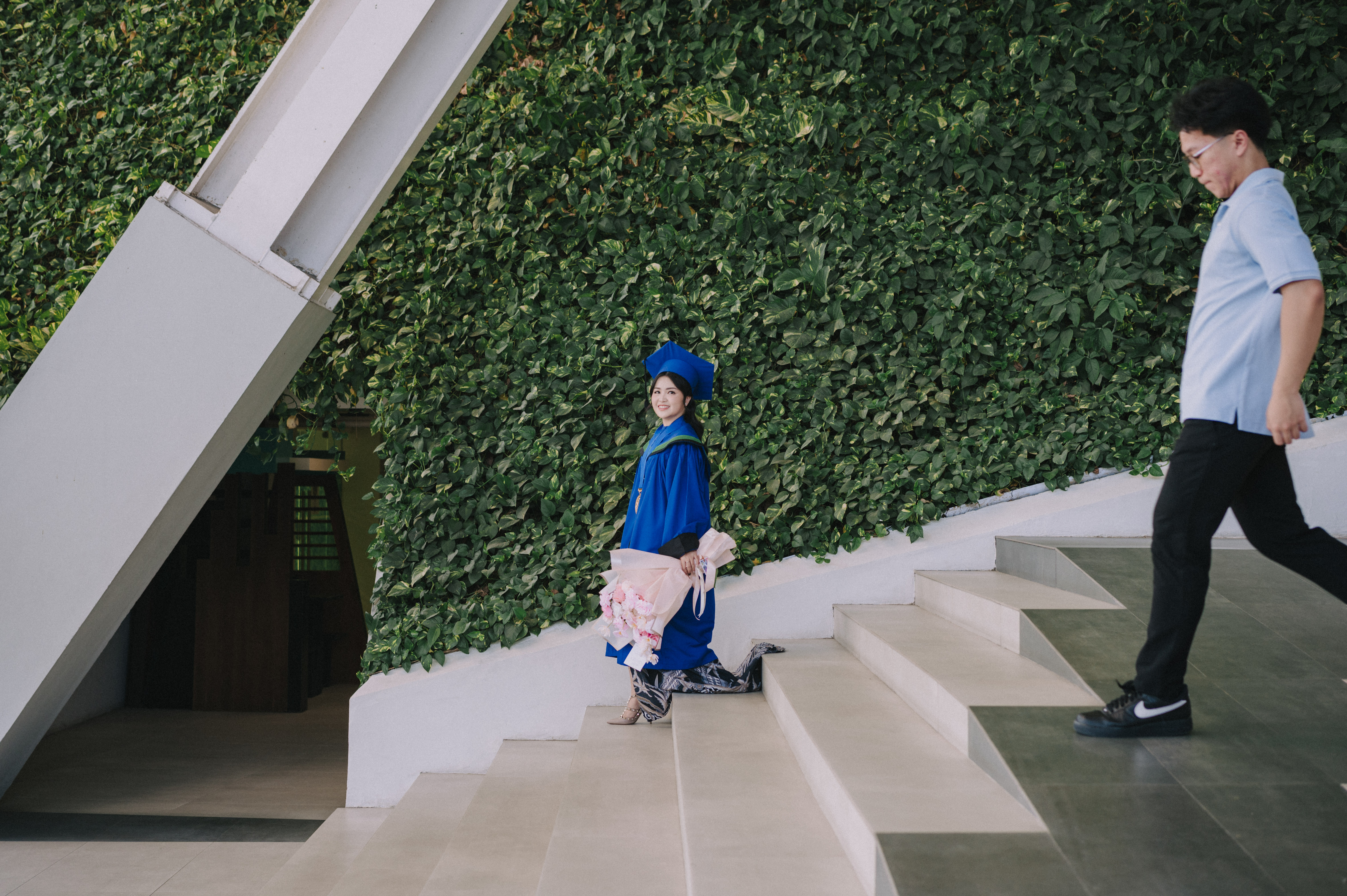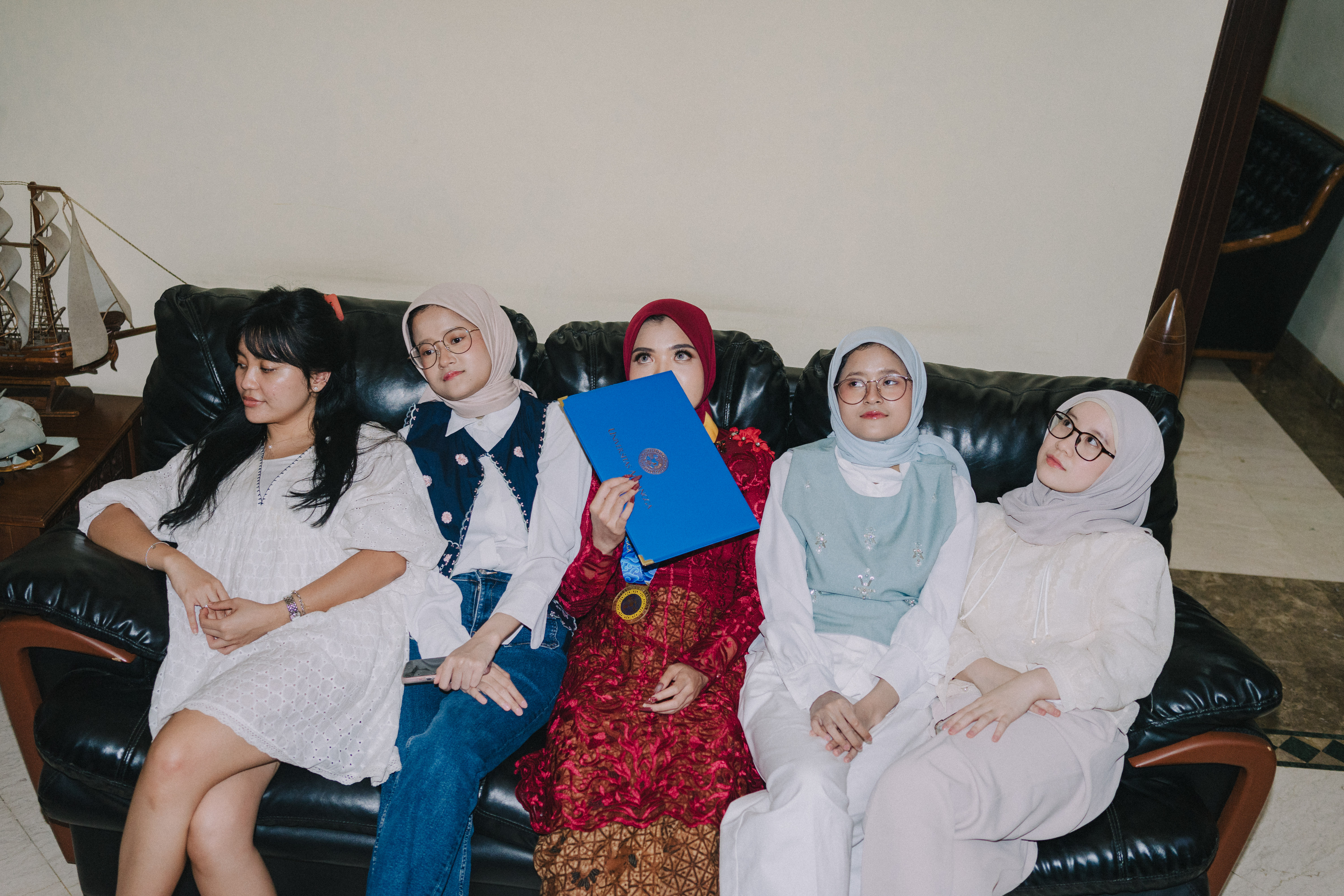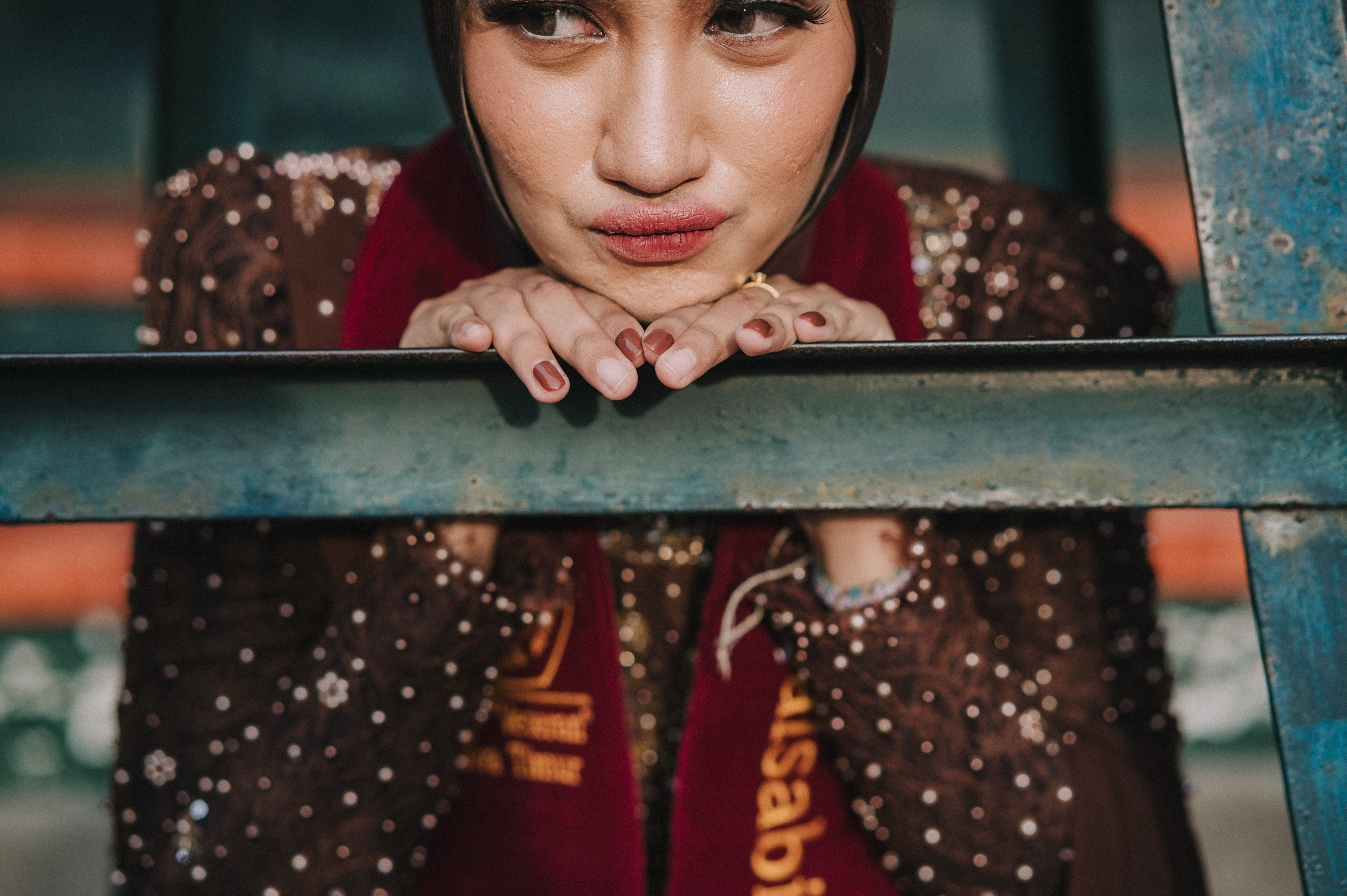 Sesi kelulusan di kampus Surabaya dengan tone hangat.